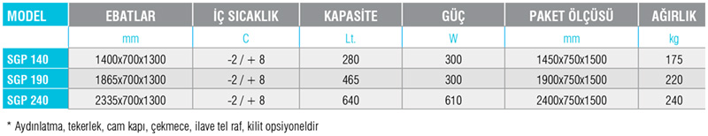 Aydınlatma, tekerlek, cam kapı, çekmece (1/3-1/2-2/3 seçenekleri), ilave tel raf ve kilit müşteri talepleri doğrultusunda opsiyoneldir.